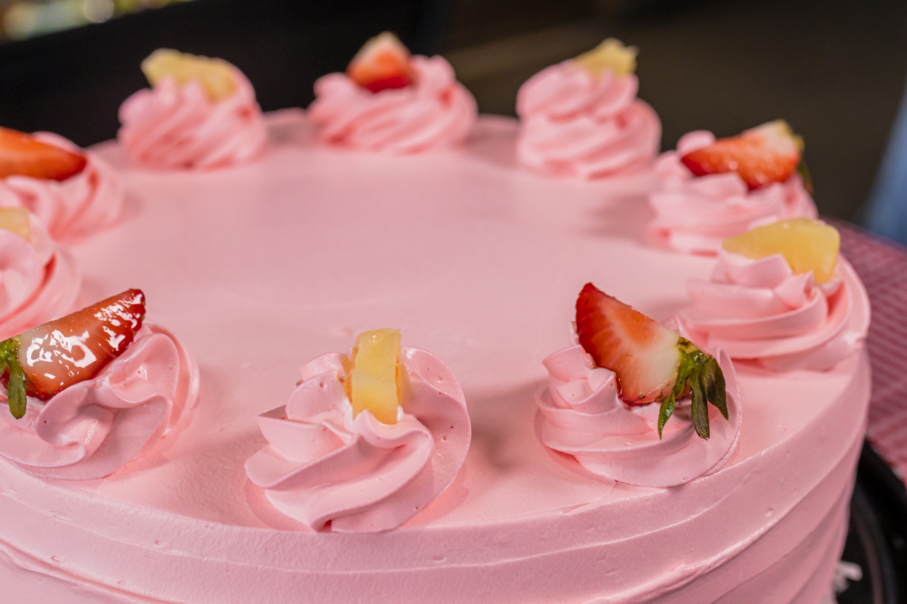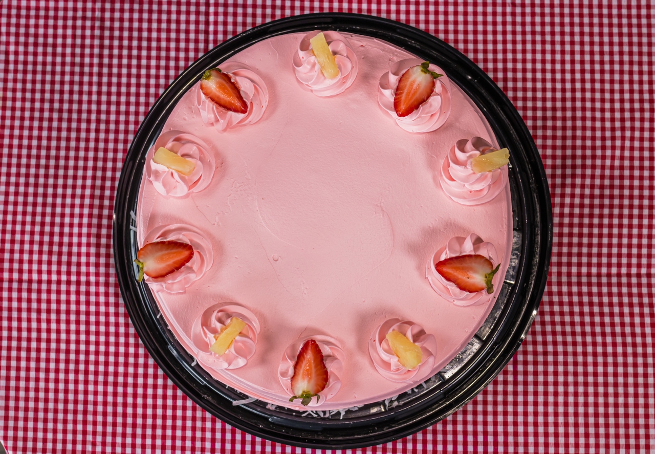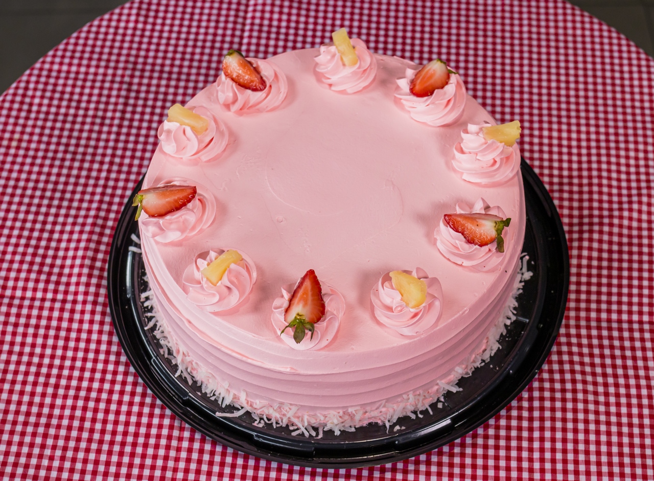 Esponjoso pan de fresa inyectado con mezcla piña colada, cubierto en crema batida color rosa decorado con trocitos de piña y rebanadas de fresa.